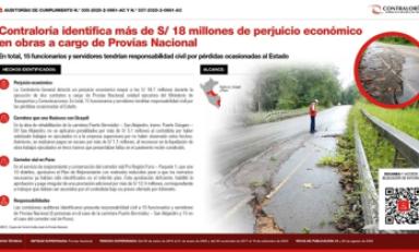 Chimbote en Línea - La Contraloría General detectó un perjuicio económico mayor a los S/ 18.7 millones durante la ejecución de dos contratos a cargo de Provías Nacional, unidad ejecutora del Ministerio de Transportes y Comunicaciones. En total, 15 funcionarios y servidores tendrían responsabilidad civil por las pérdidas ocasionadas al Estado.