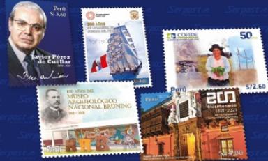 Los primeros sellos emitidos del Calendario de Emisiones Postales 2021, son el sello postal conmemorativo por el “Bicentenario del Ministerio de Relaciones Exteriores” y el sello postal conmemorativo por los “100 años del Nacimiento de Javier Pérez de Cuéllar”, que fueron puestos en circulación el 2 de julio.