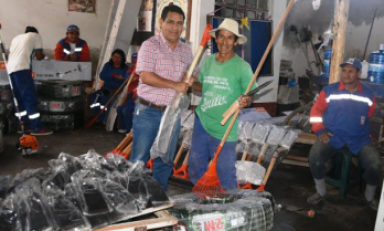 La autoridad edil acompañado de la gerente de Servicios Públicos y Desarrollo Social, Sara Ñaupari, procedió a la distribución de 10 barretas, 60 escobas metálicas, 8 machetes, manguera de 1500 metros, 30 palanas rectas, 30 picotas, 36 tijeras de dos manos, 20 tijeras de podar, 60 metros de manguera de descarga de jebe y lona de 2 pliegues, 12 de escobas de paja, 3 podadoras de altura y 3 desbrazadoras, entre los trabajadores encargados del mantenimiento de las áreas verdes y espacios públicos del distrito.