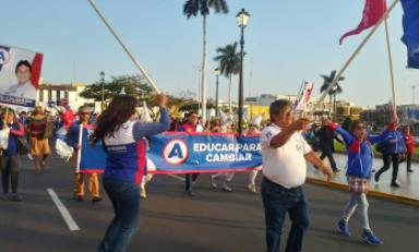 Trujillo en Línea.- Una colorida comparsa de rojo, azul y blanco, envolvió toda la Plaza de Armas de Trujillo. Los asistentes eran nada más y nada menos que simpatizantes de Alianza para el Progreso, encabezados por el regidor provincial Hernán Aquino.