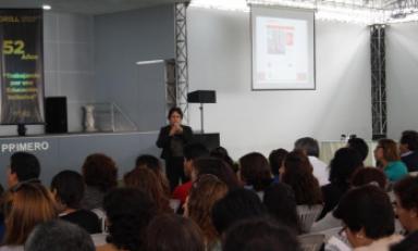 Ante más de 800 docentes y directores de los centros educativos de la región, la directora ejecutiva de Perú en Línea, explicó los objetivos del mencionada programa y las ventajas que ofrece para la formación de los estudiantes en la cultura digital y la difusión de noticias desde sus escuelas.