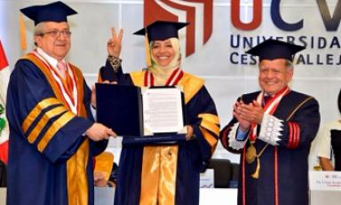 Trujillo en Línea.- El fundador de la Universidad César Vallejo, César Acuña Peralta, en la ceremonia central con motivo de conmemorar 26 años de vida institucional, condecoró a la luchadora social yemení Tawakkol Karman, Premio Nobel de la Paz 2011, quien recibió la distinción Doctora Honoris Causa.
