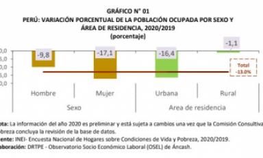 De acuerdo a los resultados de la Encuesta Nacional de Hogares (ENAHO), en el año 2020, la población ocupada a  nivel nacional alcanzó un total de 14 millones 901 mil 800 personas, y a la vez, registró una disminución de 13,0%,  respecto al año anterior, lo que equivale a 2 millones 231 mil 300 trabajadores menos.