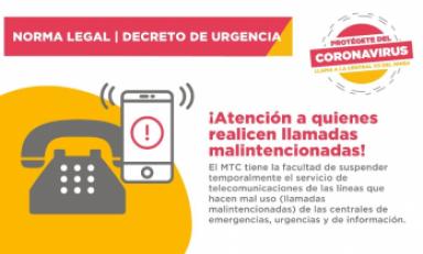 Como se recuerda, durante el periodo de Declaratoria en Emergencia Sanitaria, el MTC, a través de la Dirección General de Fiscalizaciones y Sanciones en Comunicaciones (DGFSC) está habilitado para disponer la suspensión temporal del tráfico saliente del servicio de telecomunicaciones de las líneas de abonados desde la cual se realizan comunicaciones perturbadoras que podrían afectar la atención oportuna de verdaderas emergencias.