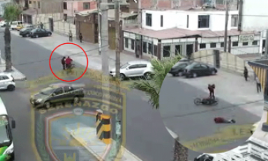 Trujillo en Línea.- En cuestión de segundos, un transeúnte fue atropellado por un motociclista que iba a excesiva velocidad. El accidente fue grabado por las cámaras de seguridad del distrito de Víctor Larco.