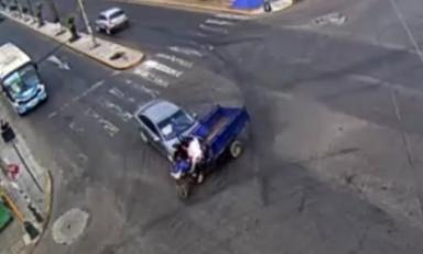 Justo en la intersección y faltando poco para que la motocarga cruce al otro lado, se produce el impacto lateral ocasionando que ambos tripulantes de la unidad menor caigan a la pista, haciendo varias vueltas de campana.