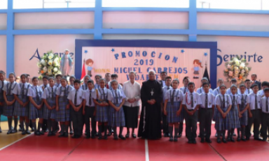Minutos antes, el Arzobispo fue recibido por toda la promoción “Mons. Miguel Cabrejos Vidarte OFM 2019”, estudiantes de diversos grados académicos, docentes, personal de servicio y padres de familia, encabezados por el promotor, R.P. Alejandro Preciado Muñoz, en las afueras del referido plantel educativo.