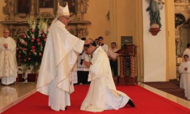 Ell candidato al sacerdocio, de rodillas recibió la imposición de manos de Mons. Miguel y de todos los sacerdotes invitados a la solemne ceremonia.