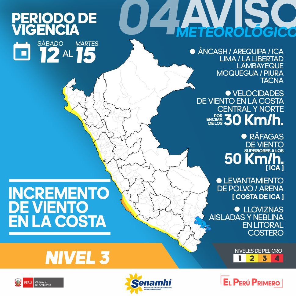 Las regiones alertadas además de Ica (provincias Chincha, Ica, Nasca y Pisco), Áncash (Casma, Huarmey, Santa), Arequipa (Camaná, Caravelí, Islay), La Libertad (Ascope, Chepén, Pacasmayo, Trujillo y Virú), Lambayeque (Chiclayo y