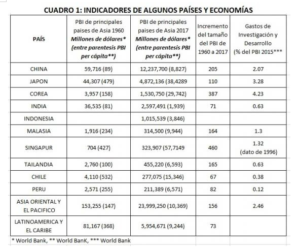 Entre 1960 y 2017 la economía de Corea y la de Japón se multiplico por 387 veces y 110 veces respectivamente, mientras que la de Perú y Chile solo en 82 veces y 67 veces respectivamente. Entre esos años el PBI de Asia se multiplico por 156 veces, la de Latinoamérica solo 73 veces, esto es Asia creció el doble que Latinoamérica.