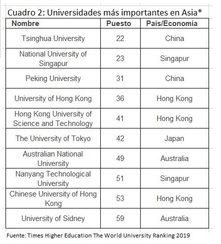 No es de extrañar por eso que existen muchas mejores Universidades en Asia que en Latinoamérica. Es interesante notar que de acuerdo al Ranking de las mejores Universidades del mundo de Times Higher Education The World University Ranking 2019, entre las mejores del 1 al 200 no aparece ninguna de Latinoamérica, pero si varios de Asia. Ver Cuadro 2.