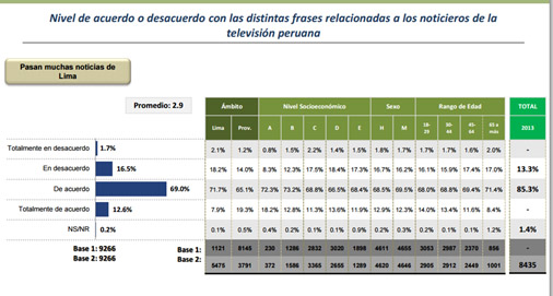 En el 2003, luego de las elecciones regionales, el 84.2% de las noticias trasmitidas tuvieron lugar en la ciudad de Lima. 6 Una década después la situación no ha cambiado y por ello es válida la percepción de los televidentes peruanos que en 81% opina que los noticieros de la televisión pasan muchas noticias de Lima 7.