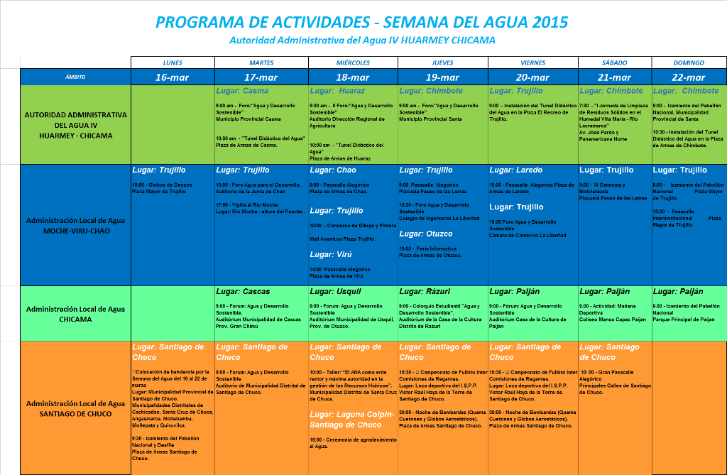 La Autoridad Administrativa del Agua IV Huarmey – Chicama comprende las Administraciones Locales de Agua de: Casma-Huarmey, Santa-Lacramarca-Nepeña, Huaraz, Moche-Virú-Chao, Chicama y Santiago de Chuco, pertenecientes al ámbito de la AAA IV Huarmey – Chicama. En todos estos ámbitos se han organizado más de 50 actividades desconcentradas.