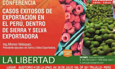 Trujillo en Línea.- El Comité Ejecutivo Regional Exportador La Libertad – CERX, con el patrocinio del Gobierno Regional de La Libertad, ha organizado una serie de ponencias, conferencias y una feria que reunirá a empresas exportadoras de la región en el auditorio y explanada de la Universidad Privada Antenor Orrego (UPAO) este martes 7 de noviembre en la ciudad de Trujillo.
