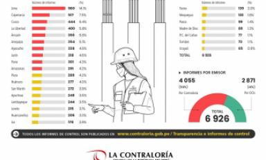 De los 6,926 informes publicados, 2,961 corresponden a orientaciones de oficio, 2,905 a informes de control concurrente y 1,053 a visitas de control. Del mismo modo, se han publicado 5 informes de servicio de control posterior en la modalidad de acción de oficio posterior, y dos informes de servicio de control previo en la modalidad de endeudamiento interno o externo.