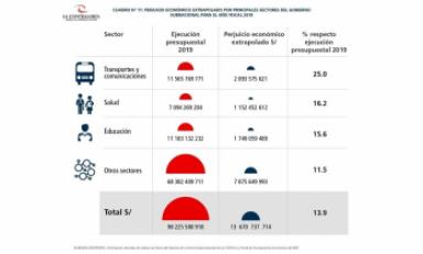 De acuerdo a dicho estudio, los sectores donde se registraron las mayores pérdidas por corrupción habrían ocurrido en los sectores de Transportes y Comunicaciones (25%), Salud (16.2%), Educación (15.6%), respecto de la ejecución presupuestal 2019 que ascendió a más de 156 mil millones de soles.