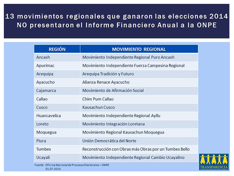 Otra razón tiene que ver con la renuencia de las organizaciones política peruanas a reportar ante la ONPE sus ingresos y gastos de campaña. Según informes del organismo electoral, los partidos y movimientos regionales declaran en promedio un tercio de lo que realmente recaudan y gastan en una campaña y no son pocos los que no cumplen con esta obligación legal. Así, 13 de los movimientos que ganaron las elecciones del 2014 y hoy gobiernan nuestras regiones no presentaron su informe financiero de ese año.