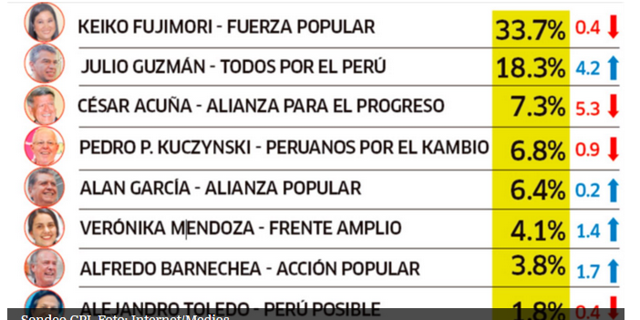Mientras que el candidato de Alianza para el Progreso, César Acuña Peralta, sigue en descenso ocupando un tercer lugar con 7.3%, cinco puntos menos en relación con el sondeo anterior. Y Pedro Pablo Kuczynski, de Peruanos por el Kambio, se sitúa cuarto con 6.8% en la intención de voto.