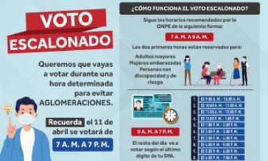 Otro cambio en la organización de los comicios es el horario: cualquier persona podrá votar entre las 7 de la mañana y las 7 de la noche, pero la ONPE recomienda hacerlo de acuerdo al último dígito del Documento Nacional de Identidad (DNI). “Le pedimos al ciudadano que vaya a votar con la mascarilla colocada correctamente, llevando su propio lapicero azul y en el horario recomendado por la ONPE”, precisó el titular del organismo electoral durante las reuniones realizadas el fin de semana.