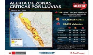 Trujillo en Línea.- Debido a las lluvias que se están registrando en la Costa y Sierra norte de nuestro país, 215 zonas críticas de Cajamarca, Áncash, La Libertad, Lambayeque, Piura y Tumbes se encuentran en alerta, informó el Instituto Geológico, Minero y Metalúrgico (Ingemmet).