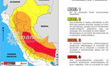 Los departamentos alertados son Amazonas, Áncash, Apurímac, Ayacucho, Cajamarca, Cusco, Huancavelica, Huánuco, Junín, La Libertad, Lima, Loreto, Madre de Dios, Pasco, Puno, San Martín y Ucayali. (Fuente Andina)