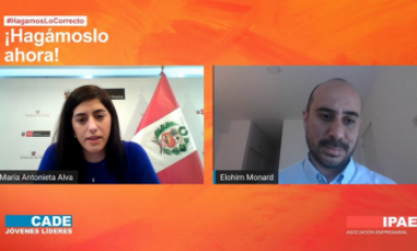 Trujillo en Línea.- IPAE Asociación Empresarial inauguró la primera edición de CADE Jóvenes Líderes 2020, bajo el lema: “Hagamos Lo Correcto ¡Hagámoslo ahora!” y cuyo objetivo es inspirar, dialogar e integrar ideas de los participantes, quienes están unidos por un mismo propósito: contribuir con el desarrollo del país. La Ministra de Economía y Finanzas, María Antonieta Alva, se presentó en este primer día para comentar su experiencia y ‘La importancia de tener un propósito’; ella fue acompañada por Elohim Monard, Docente de la Universidad de Lima, quien condujo la sesión.