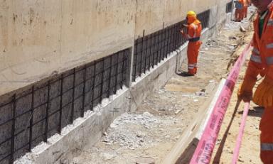 Las labores realizadas consisten en la reposición del concreto en el muro lateral izquierdo, que se vio afectado por la presencia de sales en el suelo de fundación.