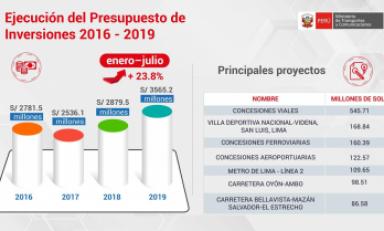 En el periodo enero-julio de 2019, se invirtieron S/ 3565.2 millones para desarrollar proyectos. Esta cifra es 23.8% superior a la alcanzada en el mismo periodo del año pasado y, en el sétimo mes del año, se alcanzó una ejecución de S/ 846 millones, lo que significa 49.6% más que en julio de 2018.