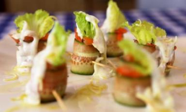Para formar los rollitos. Despuntar el pepino, lavar, secar y cortar en láminas finas a lo largo. Disponer sobre una lámina de pepino, las de trucha y una hoja de lechuga, enrollar. Repetir la operación hasta agotar los ingredientes.