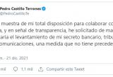 Trujillo en Línea.- El primer mandatario Pedro Castillo, informó a través de sus redes sociales que ha solicitado de manera voluntaria el levantamiento de su secreto bancario, tributario y de comunicaciones, una medida que, según dijo, "no tiene prece
