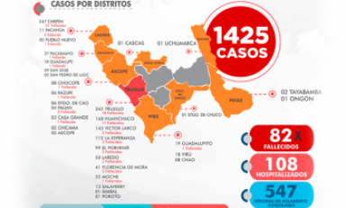 Las cifras de pacientes por distrito se presentan así: Trujillo sigue albergando la mayoría de casos: Trujillo (362 y 18 fallecidos), Huanchaco (168 y 11 fallecidos), Víctor Larco (145 y 5 fallecidos), La Esperanza (112 y 3 fallecidos) El Porvenir (99 y 3 fallecidos), Laredo (50 y 3 fallecidos), Florencia de Mora (41 y 1 fallecido) Moche (22), Salaverry (13) y Simbal que confirmó su primer caso al igual que Poroto.