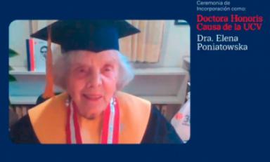 La ceremonia se llevó a cabo este lunes 18 de abril de manera virtual. La Dra. Elena recibió la distinción desde México, país donde radica, y se mostró muy emocionada ya que considera a Vallejo uno de los poetas más resaltantes de habla hispana. “Agradezco al fundador Dr. César Acuña Peralta, a la presidenta ejecutiva Dra. Beatriz Merino, a la rectora Jeannette Tantaleán y a todo el Consejo Universitario. Gracias por este reconocimiento a mis 90 años; pretendo dar las gracias a la generosidad universitaria latinoamericana que mantiene viva y difunde la extraordinaria obra de César Vallejo. Recibo este doctorado muy conmovida y tan agradecida como la cordillera de los Andes que todos los mediodías recibe los rayos del sol”, fueron las palabras de la escritora.
