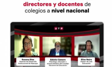 En este encuentro participó Jonathan Golergant, Rector de la UTP; y Edistio Cámere, psicólogo, educador y actual miembro del Consejo Nacional de Educación (CNE). Las exposiciones estuvieron a cargo de Susana Díaz, gerente de Desarrollo Institucional de Adecopa, con el tema “El director y el desafío de liderar personas en sus escuelas”; y Elías Neira, asesor de Cala Educación, con la charla “¿Cómo desarrollar equipos de alto rendimiento en la gestión del cambio en nuestras escuelas?”.