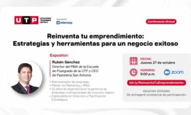 Trujillo en Linea.- La Universidad Tecnológica del Perú ofrecerá la conferencia virtual gratuita “Reinventa tu emprendimiento: estrategias y herramientas para un negocio exitoso”, dirigida a negocios pequeños y medianos, empresarios, comercios y público interesado en el tema.