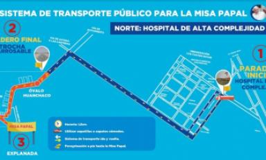 Desde el 20 de enero, antes de las 00:00 hasta las 6:00 a.m., se utilizará el corredor vía. Este sistema de transporte público partirá de dos puntos: Óvalo Papal (para las personas provenientes del Sur de la ciudad) y Óvalo Coca Cola (para las personas provenientes del centro de la ciudad). Todos ellos, incluso los que ingresarán por otra vía, provenientes del norte, llegarán sólo hasta un kilómetro antes del Óvalo Huanchaco (llamado Ovalo Papa Francisco), para luego caminar hasta la explanada.