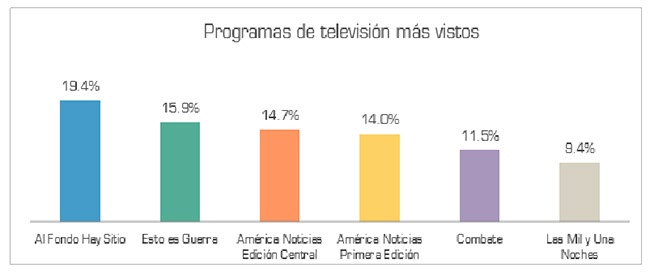 Según el reciente estudio del Consejo Consultivo de Radio y Televisión (Concortv), realizado en 21 ciudades del país, los programas más vistos por los peruanos son “Al Fondo Hay Sitio” (19%) y “Esto es Guerra” (16%); éste último, sumado al porcentaje de su competidor “Combate” hacen juntos 37.4 % de la preferencia del público televidente peruano.