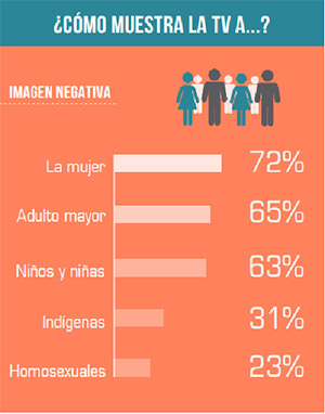 Según el estudio del Concortv, el 71.9% de los entrevistados considera que la televisión peruana muestra a la mujer de forma negativa; y la tendencia va en aumento si comparamos las estadísticas del 2013. Otros grupos afectados son las personas adultas mayores, y niños y niñas.