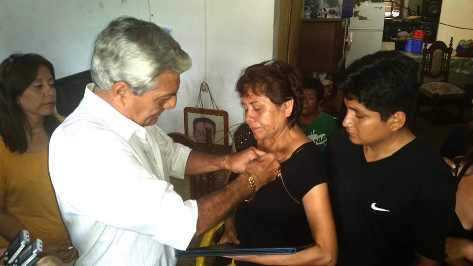 “Hemos coordinado con la Policía y la Fiscalía para que se reúnan con sus familiares y puedan coordinar acciones en conjunto a fin de que este crimen no quede impune. Toda la población merece conocer a los autores del asesinato de este luchador social”, manifestó el burgomaestre durante la entrega de la medalla a la viuda de Joel Quiroz, Gladys Murga Malca.