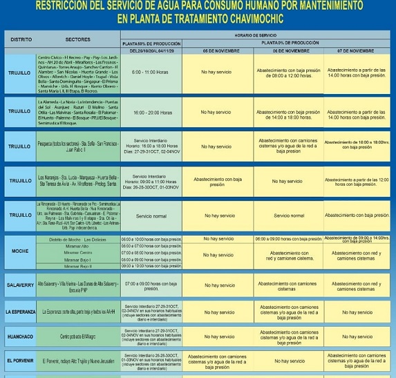 Los funcionarios del PECH advirtieron oportunamente a los representantes de SEDALIB que deberán tomar las acciones preventivas del caso, ya que se les restringirá el suministro de agua potable de la siguiente manera: del 26 de octubre al 04 de noviembre la Planta de Agua Potable abastecerá a un caudal de 600 litros de agua por segundo, es decir no hay razón para faltarle agua a la población; y que solo hoy 05 y mañana 06 de noviembre se restringirá totalmente el servicio de agua por el mantenimiento del Cisterna y Reservorio.
