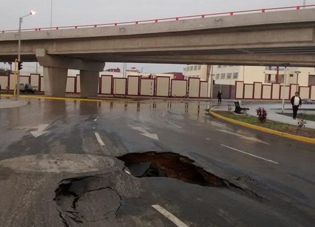 Trujillo en Línea.- El bypass recientemente inaugurado en el óvalo Grau estaría en inminente peligro tras la ruptura de la tubería matriz que abastece de agua a la ciudad de Trujillo, lo que ocasionó que se formaran tres enormes forados en esta vía principal.