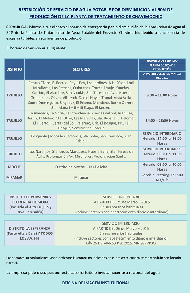 Descartó de esta manera que se le haya restringido la dotación del servicio a la empresa paramunicipal, Sedalib. Como se sabe a través de redes sociales la empresa distribuidora de agua anunció el recorte del servicio desde hoy en Trujillo y varios distritos como La Esperanza, El Porvenir, el sector Miramar y otros, debido a que el proyecto Chavimochic habría restringido la entrega del líquido elemento en un 50 por ciento.