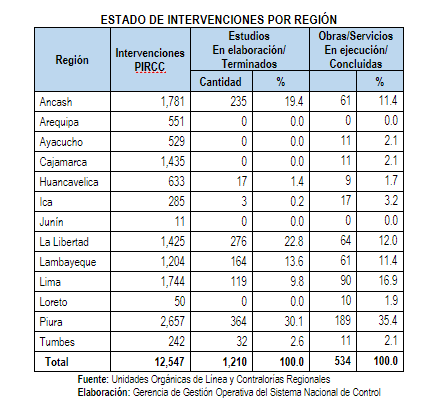 Desde una perspectiva regional se advierte que la región Piura es la que tiene mayores avances en obras y servicios en ejecución y concluidas (189), seguido de Lima (90), La Libertad (64), Ancash (61) y Lambayeque (61).