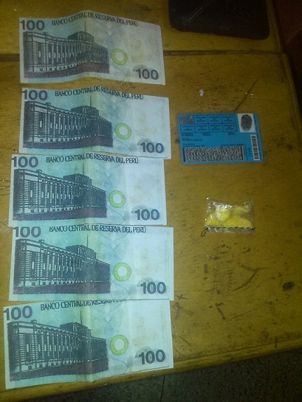 Al efectuar el registro personal, al primero de ellos le encontraron entre su indumentaria una bolsa plástica con unos 30 gramos de cocaína y un teléfono móvil; al segundo, un celular, una dosis de éxtasis y seis billetes nuevos de cien soles cada uno, todos falsos, ya que tienen impreso el mismo número de código: B4036285L.