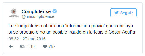 Trujillo en Línea.- La Universidad Complutense de Madrid informó hoy que abrirá una "información previa" a la tesis doctoral que presentó el candidato de Alianza para el Progreso (APP), César Acuña, a fin de determinar si hubo o no un posible fraude, tras denunciarse supuestos plagios en algunas partes de dicho documento.