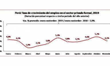 Trujillo en Línea.- El empleo formal en el sector privado a nivel nacional mantiene un crecimiento ininterrumpido de 32 meses y en noviembre de 2019 creció en 4,1% con relación al mismo mes del año anterior, lo que significó que se generaran alrededor de 151 mil 383 nuevos empleos formales, según la Planilla Electrónica (PLAME y T-Registro) del Ministerio de Trabajo y Promoción del Empleo.