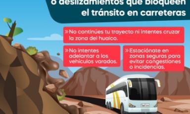 Ante la ocurrencia de huaicos que bloqueen el tránsito vehicular en la carretera, es recomendable que los conductores no continúen con su trayecto, no intenten cruzar la zona de huaico, ni realicen actos temerarios que pongan en peligro su vida y la de los usuarios.