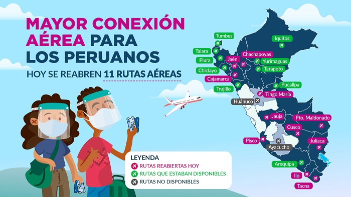 Ante la reapertura de más rutas aéreas, el ministro de Transportes y Comunicaciones, Carlos Estremadoyro, exhortó a los pasajeros a decidir de manera responsable sobre la necesidad de los viajes a emprender. “Muchos ciudadanos necesitan trasladarse por vía aérea por motivos de trabajo, estudios o salud. Ahora tienen más rutas para trasladarse, pero les pedimos ser responsables al acceder a los viajes aéreos. Aún no hemos superado la emergencia sanitaria por el Covid-19. Podemos viajar, pero hagámoslo por razones justificadas”, manifestó.