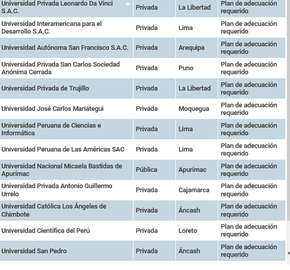 Otras 21 están en Plan de Adecuación Requerido, 3 tienen Plan de Adecuación Aprobado y en 9 de los casos la Sunedu está realizando la Verificación Presencial, como a continuación se detalla en los siguientes cuadros.