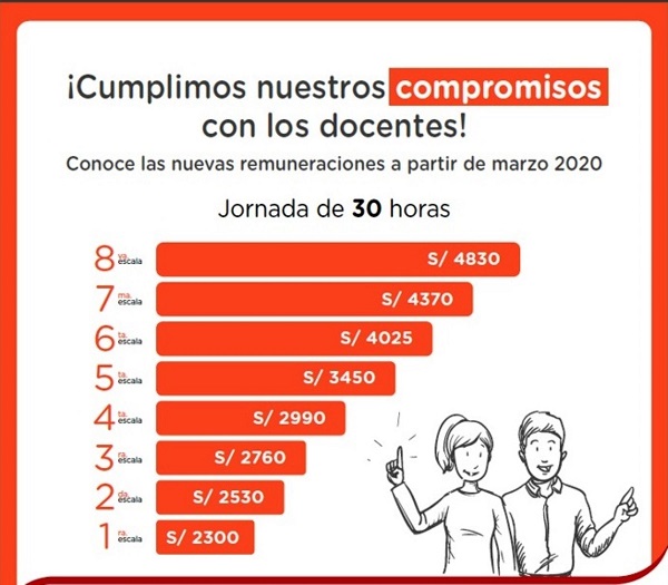 Informó que la remuneración base para los docentes con jornada de 30 horas será S/ 2,300 para la primera escala, mientras que para la escala VII será S/ 4,370. En el caso de los docentes con jornada de 40 horas, la remuneración fluctuará entre S/ 3,067 y S/ 5,827.