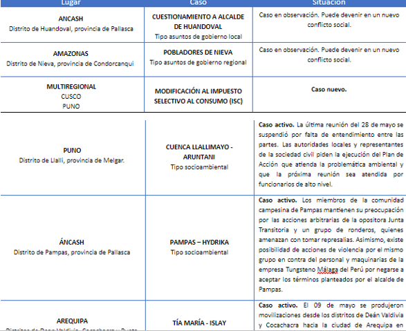 Trujillo en Línea.- Durante el mes de mayo, la Defensoría del Pueblo registró cuatro nuevos conflictos sociales, ubicados principalmente en las regiones de Áncash, Huánuco, Piura y uno de carácter multiregional (Cusco, Puno, Tacna, Apurímac, Madre de Dios, Arequipa), según lo señala el Reporte de Conflictos Sociales N°171 presentado hoy.